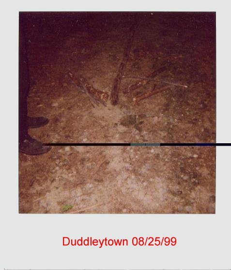 When going into Dudleytown, the group took note of this log lying across the trail. However, when leaving Dudleytown, the group noticed that the log had been broken, and lain in the form of an arrow. The group is unsure as to how this arrow was made, because no members of the group left the main group at any time, save for the two members that left near the beginning of the trail. It was also decided that it was impossible for these two members to find the log without lights, and break the oak without leaving footprints.
