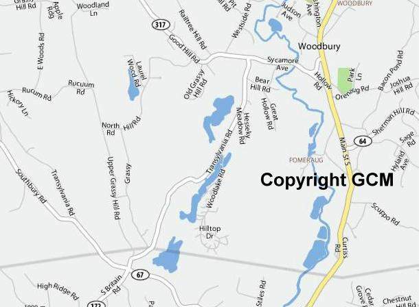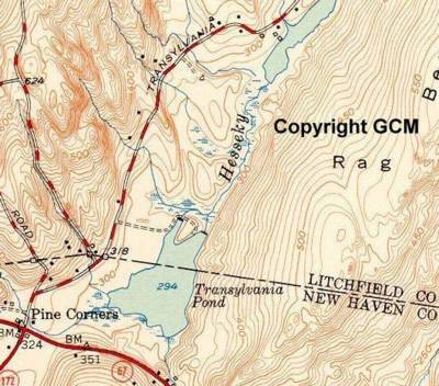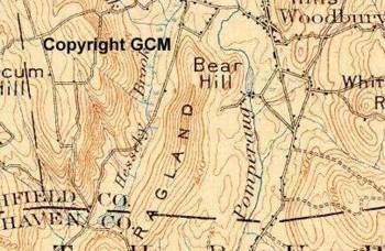 Left at Roxbury Station, a dirt road crosses the railroad and turns into the property known as MINE HILL. (private property, visitors welcome, park car and proceed on foot; care should be taken to avoid hidden mine shafts), 0.3 m. The mine, which was originally opened in 1750 by prospectors who hoped to find silver, contains one of the few American deposits of siderite.The vein of spathic iron averaged about 8 feet in width and was uncovered for a distance of one mile. More than a million dollars were expended in developing the mine, which for 42 years was operated by the American Smelting Company. Ten tons of pig iron was the average daily output. Now maintained for demonstration purposes by the Columbia School of mines, Mine Hill is of especial interest, not only because of its iron deposit is a fine example of an ore vein along a fault, but also for the many large and perfect pyrite crystals and other minerals in small crystals which can be found here.